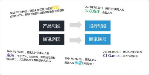 启飞科技分析,腾讯已经慢慢由产品思维向投行思维的转变,所谓产品思绪,即是对被收购的企业进行绝对的控制,然后才能控制被收购企业的产品,为了 能把产品体验做到最好,腾讯什么都做,最后发现,有些东西并不是腾讯擅长,不是有了流量就一定能做好,因此腾讯逐渐改变策略,在并购的时候会选择特定行业里最好的平台型合作伙伴,通过微信和手机QQ这两大跨运营商的平台型应用,整合产业链,与合作伙伴一起创造更好的用户体验,当他们做得更好时,腾讯也能享受到业绩分享,所以腾讯开放式平台战略的重要关键词是开放、合作、共赢。